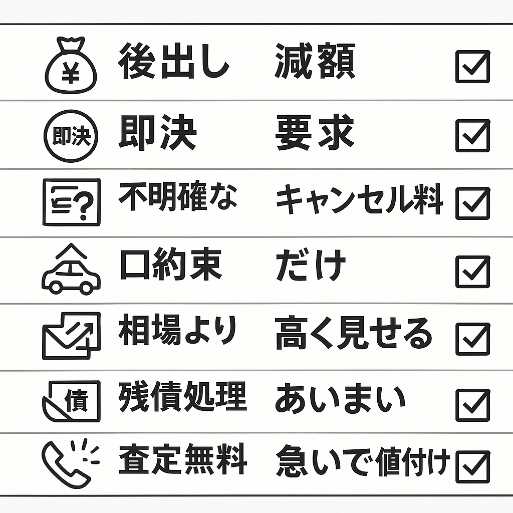 → 見積・査定内容・入金日・名義変更予定日を必ず書面/データで残す。