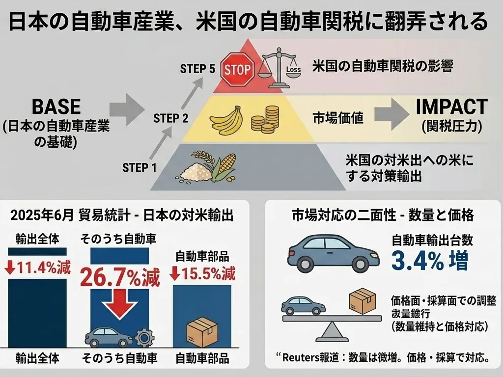 一方で、Reutersは自動車の輸出台数は3.4%増だったとも報じており、数量を維持しながら価格面や採算面で対応していたことがうかがえます。